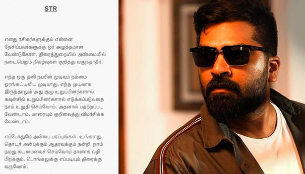 இதையறிந்த சிம்பு அறிக்கை ஒன்றை வெளியிட்டுள்ளார். அதில், ‘எனது ரசிகர்களுக்கும் என்னை நேசிப்பவர்களுக்கு ஓர் அழுத்தமான வேண்டுகோள். திரைத்துறையில் அண்மையில் நடைபெறும் நிகழ்வுகள் குறித்து வருந்தாதீர்.