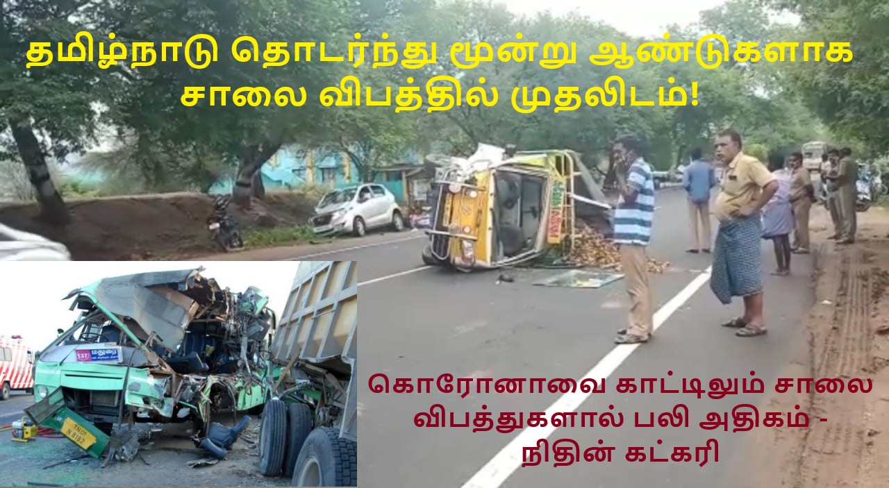 இதனிடையே தமிழ்நாடு தொடர்ந்து மூன்று ஆண்டுகளாகச் சாலை விபத்தில் முதலிடம் பிடித்து வருகிறது. 2019ம் ஆண்டில் மட்டும் 57,228 சாலை விபத்துகள் நிகழ்ந்துள்ளன. தமிழகத்தைத் தொடர்ந்து மத்திய பிரதேசம் இரண்டாம் இடத்தில் 51,641 சாலை விபத்து பதிவுடன் உள்ளது. மூன்றாம் இடத்தில் கர்நாடகா 40,644 எனும் எண்ணிக்கையில் உள்ளது.
