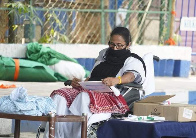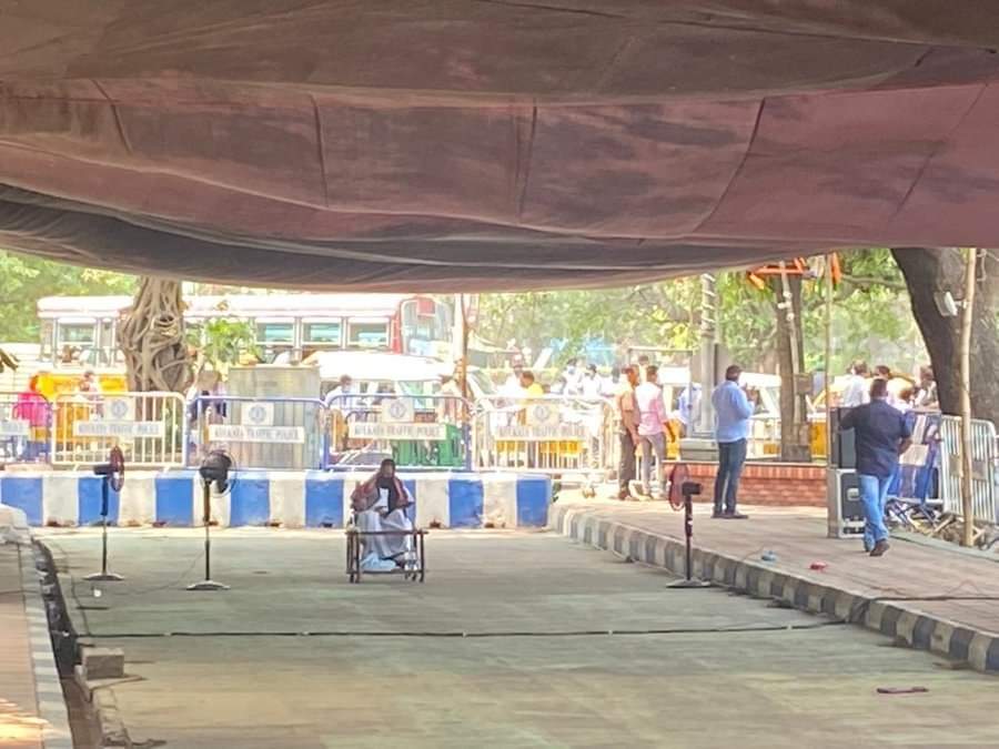இன்றைய தர்ணா போராட்டத்துக்கும் சக்கர நாற்காலிலேயே வந்தார். அந்த மைதானத்தில் உள்ள மதில்சுவரை ஒட்டி சாமியானா பந்தல் போடப்பட்டு இருந்தது. அதற்கு கீழே மம்தா தன்னந்தனியாக சக்கர நாற்காலியில் அமர்ந்தபடி தர்ணாவில் ஈடுபட்டார்.