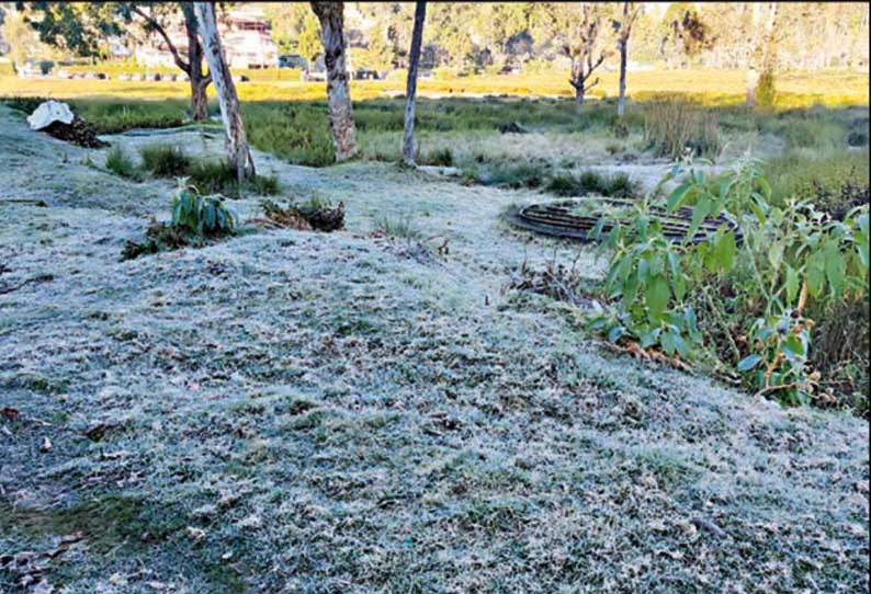 இந்த நிலையில் இன்று அதிகாலையில் 9 டிகிரி செல்சியஸ்க்கு குறைவாக வெப்பநிலை காணப்பட்டு கடும் குளிர் நிலவியதால் பசுமைப்புற்களின் மேல் விழுந்த நீர்ப் பனித் துளிகள் உறைந்து உறைபனியாக மாறியது.