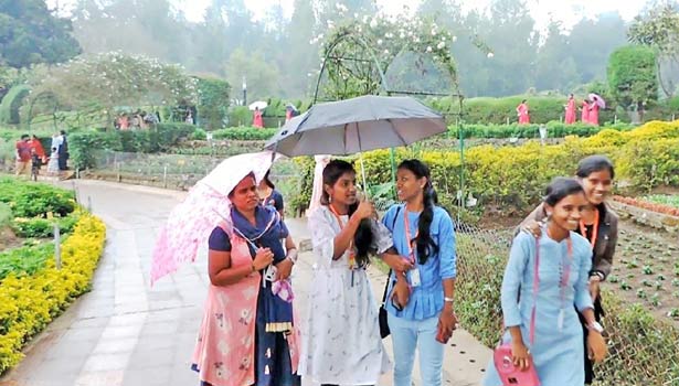 சாரல் மற்றும் கனமழையிலும் சுற்றுலாப்பயணிகள் உற்சாகமாக சுற்றுலாத்தலங்களை கண்டுரசித்தனர்.